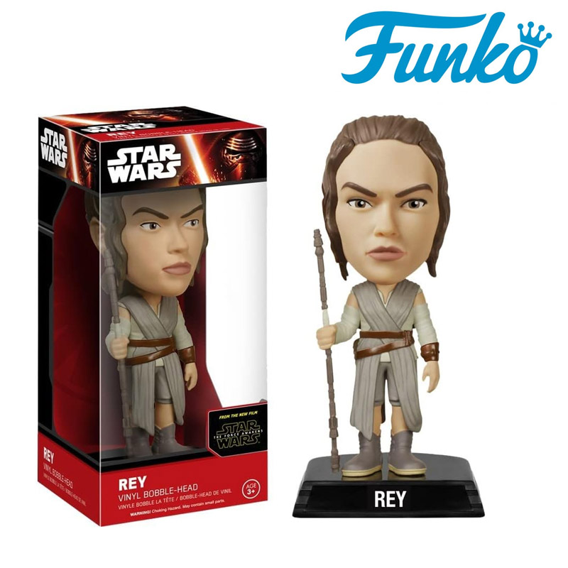 Lleva a Rey a tu hogar y deja que te recuerde las emocionantes aventuras de Star Wars Episodio VII en cada balanceo de cabeza. ¡Añade la Figura Wacky Wobbler Vinyl Bobble Head de FUNKO a tu colección hoy mismo! 🪐👑